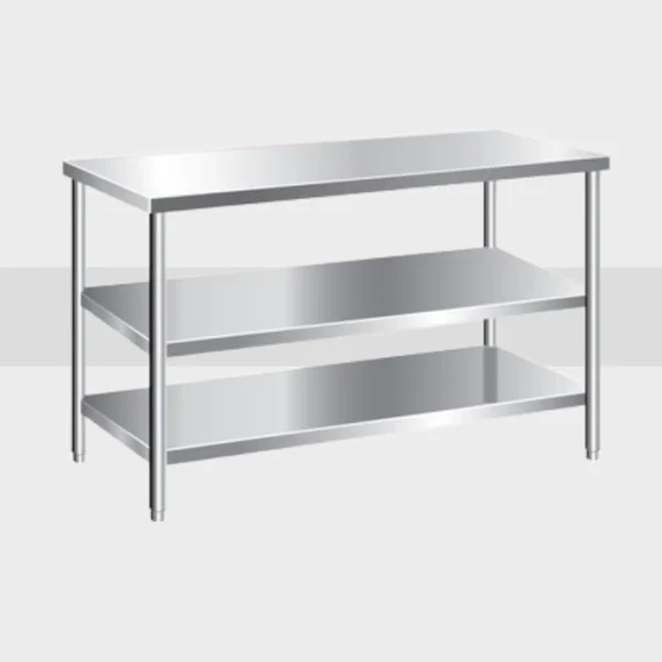 Meja kerja multifungsi ini dilengkapi dengan over shelf (rak atas) dan undershelf (rak bawah) untuk memaksimalkan efisiensi ruang di dapur profesional. Sangat cocok digunakan untuk persiapan bahan, penataan alat, dan penyimpanan peralatan dapur di restoran, bakery, katering, dan dapur produksi makanan berskala besar.